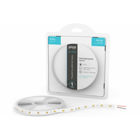 светодиодная лента длиной 5 м, нейтральный белый цвет, мощность 8 Вт/м, цветовая температура 4000 K, световой поток 900 Лм, питание 12 В, IP20