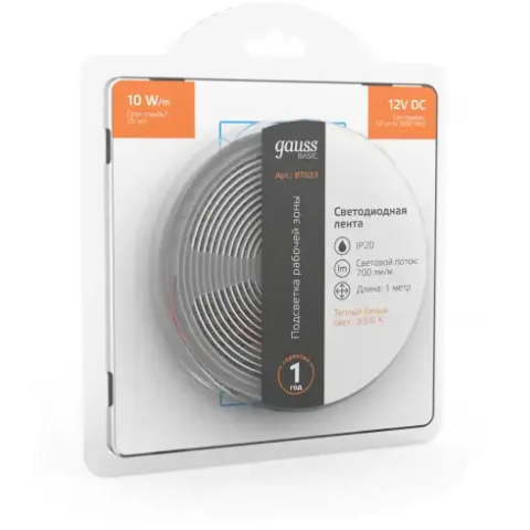 светодиодная лента длиной 1 м, тёплый белый цвет, мощность 10 Вт/м, цветовая температура 3000 K, световой поток 700 Лм, питание 12 В, IP20