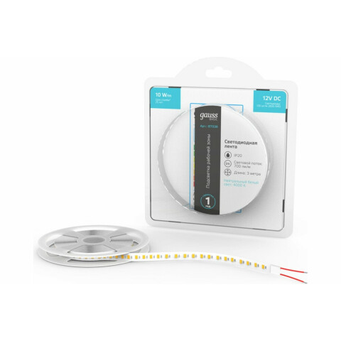 | светодиодная лента длиной 2 м, нейтральный белый цвет, мощность 10 Вт/м, цветовая температура 4000 K, световой поток 700 Лм, питание 12 В, IP20 | 178 смн. |