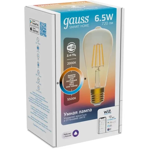 умная лампочка, цоколь E27, мощность 6.5 Вт, цветовая температура 2000-5500 K, световой поток 570 Лм, подключение: Wi-Fi, до 20000 ч работы