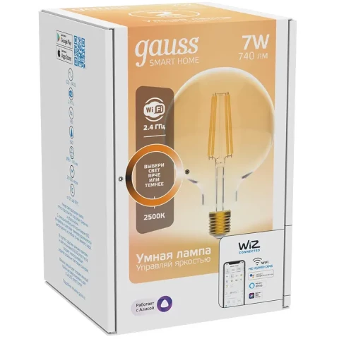умная лампочка, цоколь E27, мощность 7 Вт, цветовая температура 2500 K, световой поток 740 Лм, подключение: Wi-Fi, до 20000 ч работы