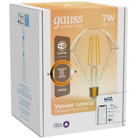 умная лампочка, цоколь E27, мощность 7 Вт, цветовая температура 2500 K, световой поток 740 Лм, подключение: Wi-Fi, до 20000 ч работы