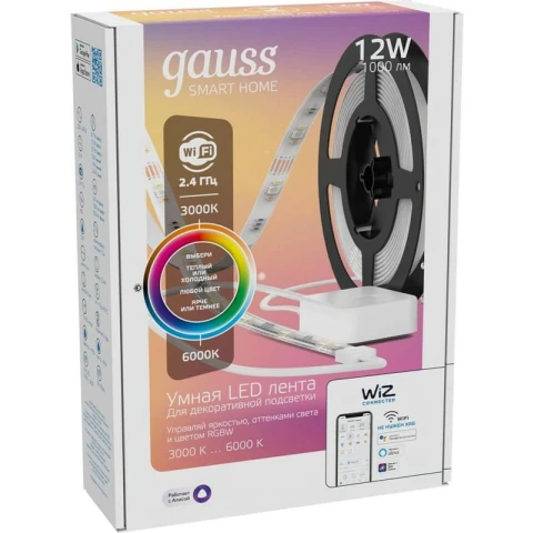 умная лента, мощность 12 Вт, цветовая температура 3000-6000 K, световой поток 1000 Лм, поддержка RGB, длина 3 м, подключение: Wi-Fi
