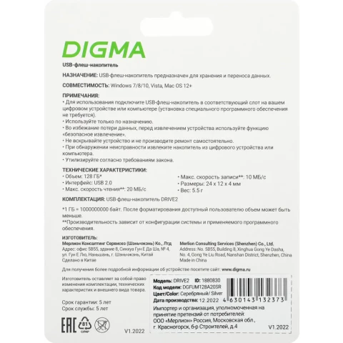 USB Flash накопитель 128Gb Digma DRIVE2 (DGFUM128A20SR)