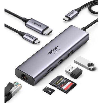 пассивный USB-концентратор, 1x USB Type-C, 2x USB 3.0, HDMI, RJ-45, кардридер, подключение через USB Type-C