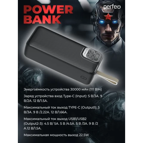 аккумулятор ёмкостью 30000 мАч, выход: 2xUSB, USB Type-C, вход: USB Type-C, 2xUSB, максимальный ток: 3 А, быстрая зарядка, индикатор заряда