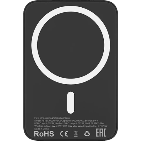 аккумулятор ёмкостью 10000 мАч, выход: USB Type-C, вход: USB Type-C, беспроводная зарядка, индикатор заряда