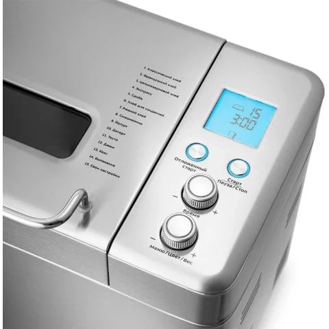 вес выпечки 1000 г, бездрожжевая выпечка, варенье, ржаной хлеб, кекс, таймер, регулировка веса выпечки, замес теста, ускоренная выпечка, выпечка в форме буханки, 15 автоматических программ