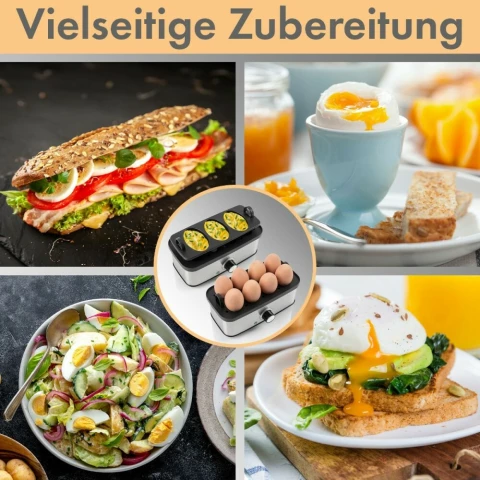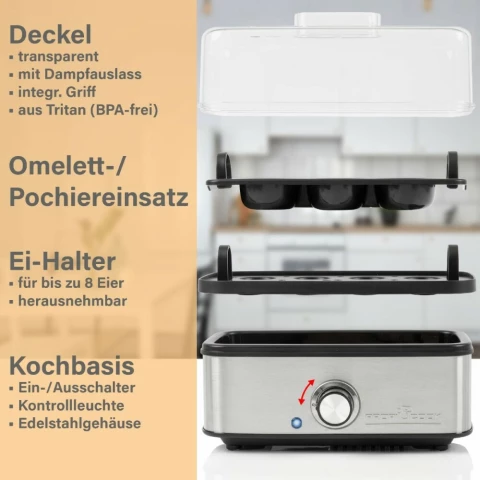 яйцеварка на 8 яиц, мощность 400 Вт, индикатор включения, нагревательный элемент из нержавеющей стали, мерный стакан, форма для приготовления омлета
