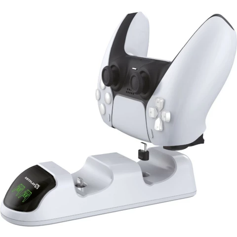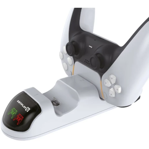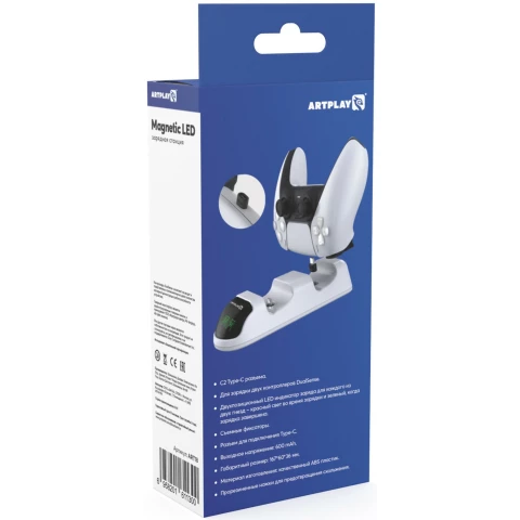 зарядная станция Artplays Magnetic LED для двух геймпадов DualSense с подсветкой PS5, подключение: USB-C, индикатор заряда, съёмные фиксаторы