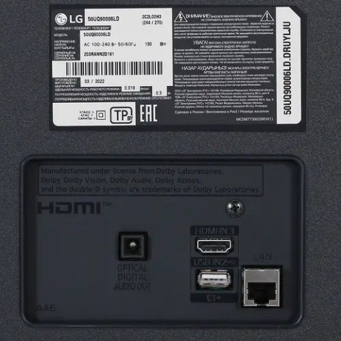 Бренд: LGдиагональ 50", разрешение 4K UHD (3840x2160), 60 Гц, HDR 10 Pro, поддержка DVB-T2, Wi-Fi, Bluetooth, 3xHDMI, RJ-45, 2xUSB, Smart TV webOS