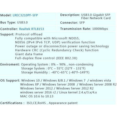 волоконно-оптический адаптер USB 3.0 - SFP 1000Base-SX/LX, многомодовый оптоволоконный порт, контроллер: RTL8153, поддержка IEEE 802.1Q VLAN, алюминиевый корпус