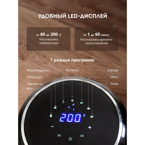 аэрогриль, мощность: 1600 Вт, полезный объем: 3.5 л, антипригарное покрытие, электронное управление, регулировка температуры