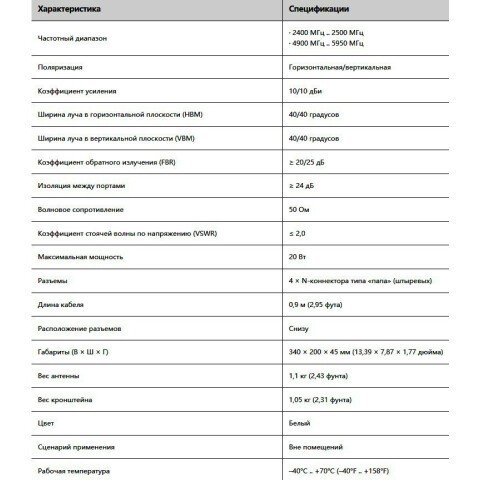 двухдиапазонная направленная антенна, предназначена для использования вне помещений, кабель 0.9м с 4x N-коннекторами (M), коэф. усиления: 10 дБи, максимальная мощность: 20 Вт, ветроустойчивость: 35 м/с