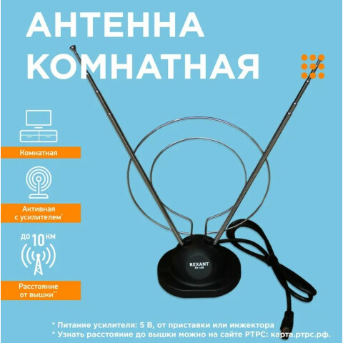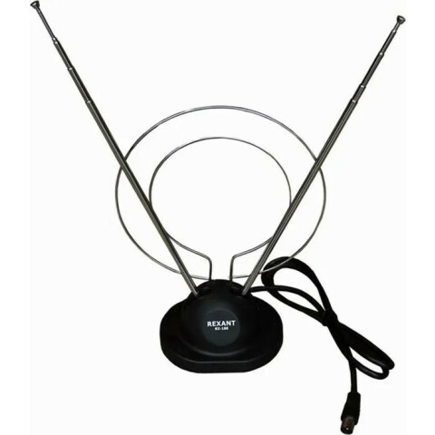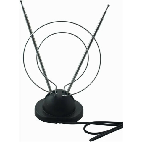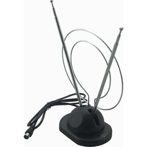 телевизионная антенна, комнатная, телескопическая, на подставке с кольцом, диапазон волн: МВ, ДМВ, диапазон частот: VHF: 47-230 МГц, UHF: 470-870 МГц, коэф. усиления: 1.5-3.5 дБ, коаксиальный кабель с F-разъёмом