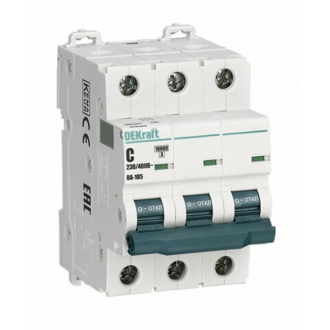 Бренд: DEKraftавтоматический выключатель на DIN-рейку, 3-полюсный, напряжение: 230/400 В, ток: 6 A, тип расцепления: C, отключающая способность: 10 kA, IP20