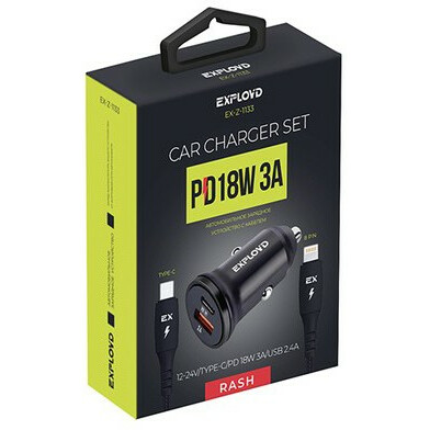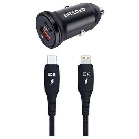Бренд: Exploydавтомобильное зарядное устройство, мощность 18 Вт, сила тока 3 A, 1x USB, 1x USB Type-C, быстрая зарядка, кабель Lightning