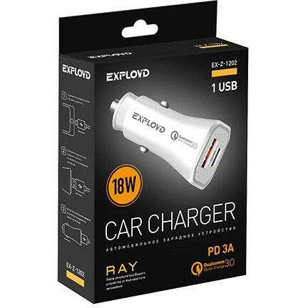 Бренд: Exploydавтомобильное зарядное устройство, мощность 18 Вт, сила тока 3 A, 1x USB, 1x USB Type-C, быстрая зарядка