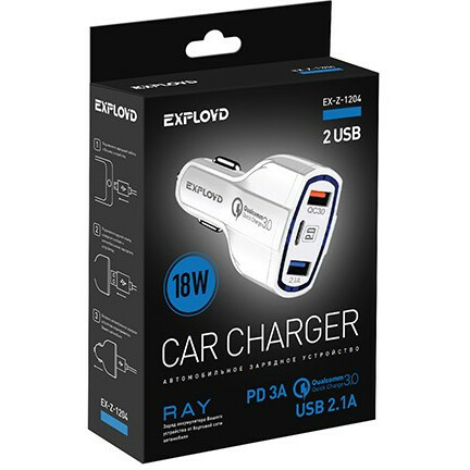 Бренд: Exploydавтомобильное зарядное устройство, мощность 18 Вт, сила тока 3 A, 2x USB, 1x USB Type-C, быстрая зарядка