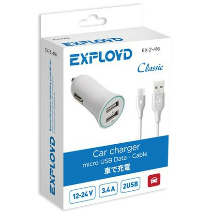 Бренд: Exploydавтомобильное зарядное устройство, сила тока 2.4 A, 2x USB, кабель microUSB