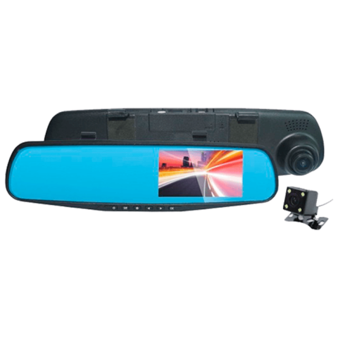 в виде зеркала с выносной камерой, угол обзора 120°, с экраном 3.5", режим циклической записи видео 1280x720 при 30 к/с, режим фотосъемки, встроенный микрофон, датчик удара (G-сенсор)