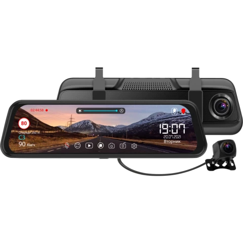 с экраном, зеркало заднего вида, с выносной камерой, запись: 1920x1080, угол обзора: 140°, экран: 10", датчик движения, GPS, ГЛОНАСС, датчик удара, встроенный микрофон, встроенный динамик