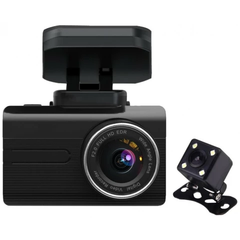 с выносной камерой, угол обзора 150°, экран 2.35", разрешение видео 1920x1080, циклическая/непрерывная запись, технология WDR, поддержка карт памяти microSD, встроенный микрофон, датчик удара (G-сенсор), GPS
