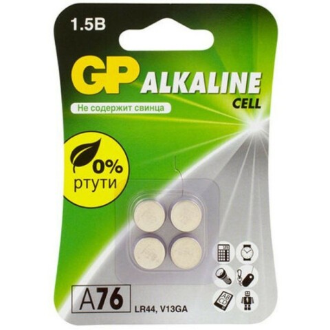 батарейка A76 (LR44), 4 шт., тип батареи: щёлочная (алкалиновая), напряжение: 1.5 В