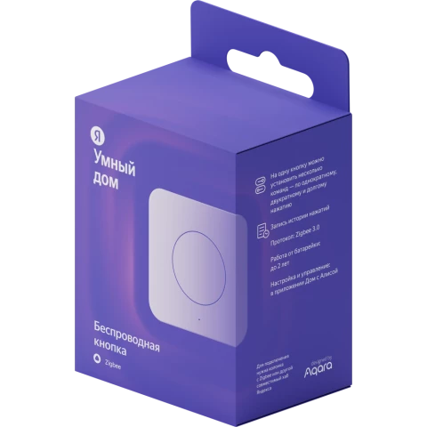 одноклавишный выключатель, поддерживает сценарии, питание от батарейки, беспроводная связь: Zigbee, совместимость с Алисой