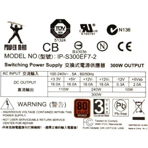 мощность 300 Вт, ATX12V 2.31, активный PFC, вентилятор 80 мм, cертификат 80 PLUS Bronze
