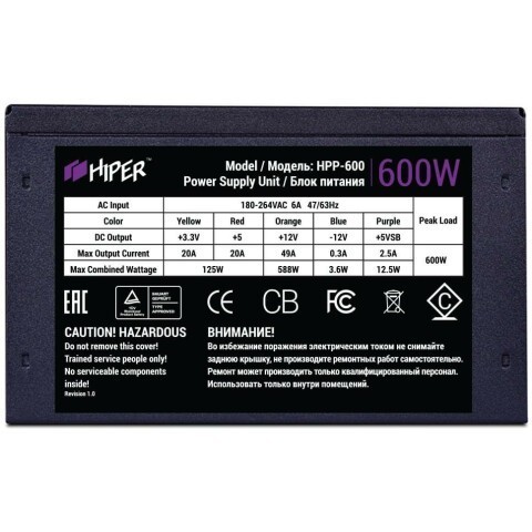 Бренд: HIPERмощность 600 Вт, ATX12V 2.3, активный PFC, вентилятор 120 мм