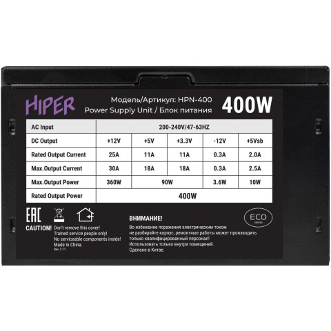 мощность 400 Вт, ATX12V 2.31, вентилятор 120 мм