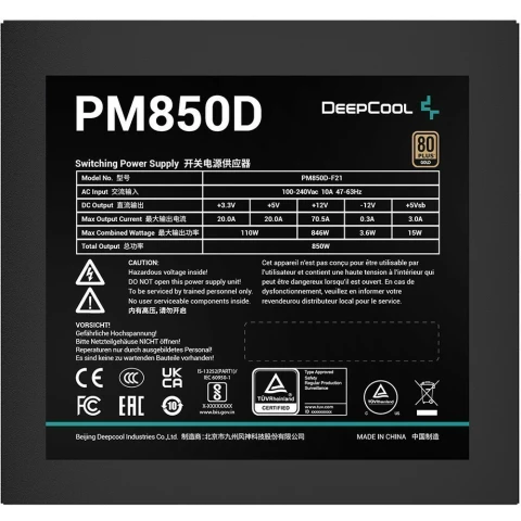 Бренд: DeepCoolмощность 850 Вт, ATX12V 2.4, активный PFC, вентилятор 120 мм, cертификат 80 PLUS Gold