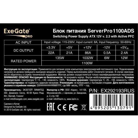Блок питания Exegate ServerPRO-1100ADS 1100W