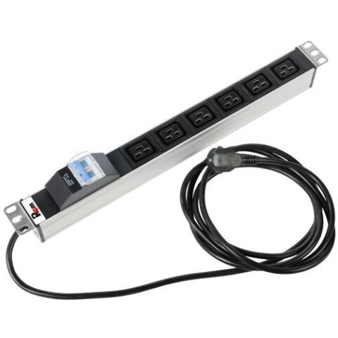 блок розеток Rem-16 с автоматическим выключателем 16А, 6 розеток IEC 60320 C19, 16A, алюминиевый, для установки в 19" шкафы и стойки, 484х45х45мм, шнур 3м
