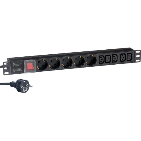 горизонтальный блок розеток, евровилка с заземлеием, розетки: 5x IEC 320 С13 + 5x Schuko, макс. ток нагрузки 16A, выключатель с подсветкой, стандарты VDE, EAC, кабель 2.5м