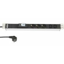 блок розеток для 19" шкафов, горизонтальный, с автоматическим выключателем, 3 розетки Schuko + 2 розетки IEC 320 C13, 16A, 250В, кабель питания 3х1.5мм2 длиной 2.5м, с вилкой Schuko, 482.6x44.4x44.4мм