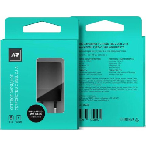 сетевое зарядное устройство, 2x USB 2.1A, кабель Type-C, чёрный, 1м