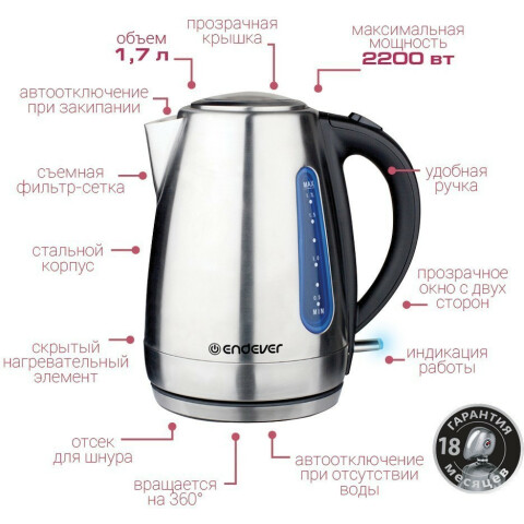 чайник, объём: 1.7 л, мощность: 2200 Вт, закрытая спираль, индикация включения, материал корпуса: металл