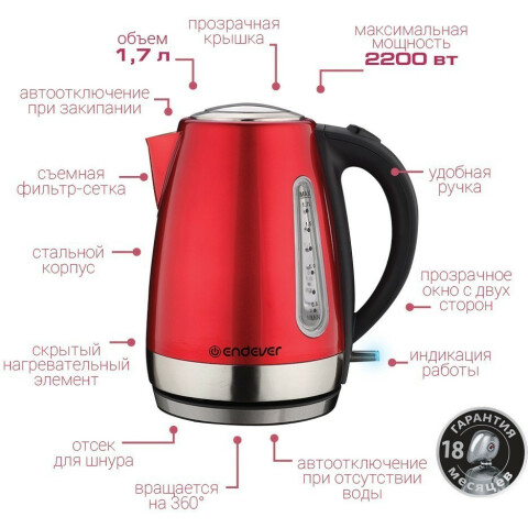 Бренд: ENDEVERчайник, объём: 1.7 л, мощность: 2200 Вт, закрытая спираль, индикация включения, материал корпуса: металл