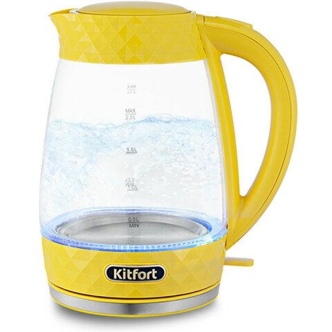 Бренд: Kitfortчайник, объём: 2 л, мощность: 2200 Вт, закрытая спираль, материал корпуса: стекло, подсветка воды при работе