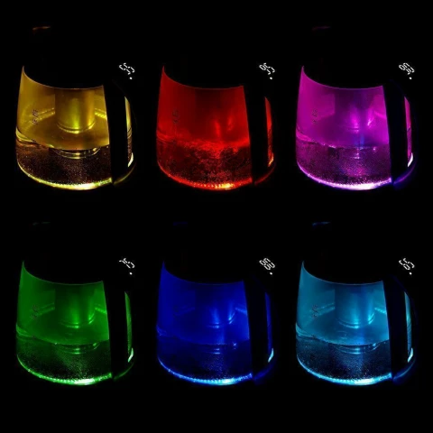чайник, объём: 1.7 л, мощность: 2200 Вт, закрытая спираль, материал корпуса: стекло, подсветка воды при работе, поддержание тепла