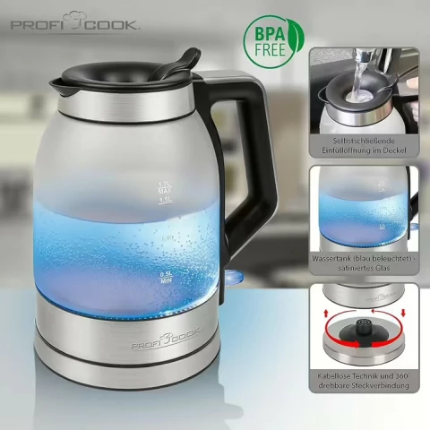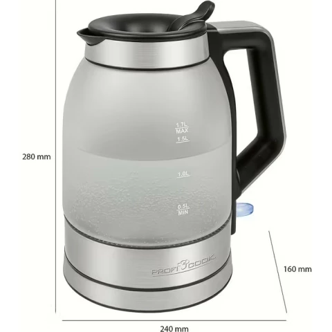 чайник, объём: 1.7 л, мощность: 2200 Вт, закрытая спираль, материал корпуса: стекло, подсветка воды при работе