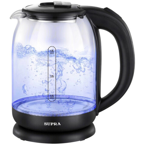 Бренд: Supraчайник, объём: 1.8 л, мощность: 1500 Вт, закрытая спираль, материал корпуса: стекло, подсветка воды при работе