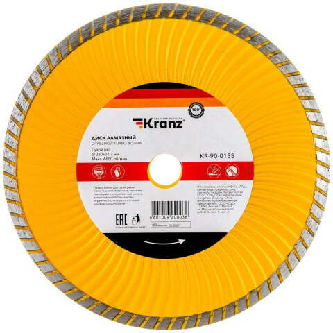 алмазный диск, по бетону, по керамике, по кирпичу, диаметр 230 мм, толщина 2.4 мм, посадочное отверстие 22.2 мм, 1 шт.