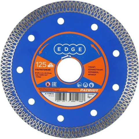 алмазный диск, по керамике, по плитке, по граниту, диаметр 125 мм, толщина 1.2 мм, посадочное отверстие 22.2 мм, 1 шт.