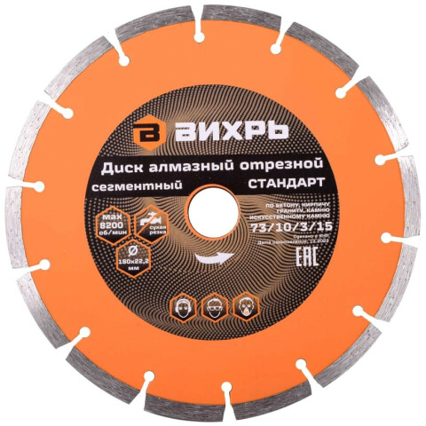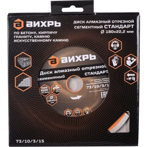 алмазный диск, по бетону, по камню, по граниту, по кирпичу, диаметр 180 мм, посадочное отверстие 22.2 мм, 1 шт.