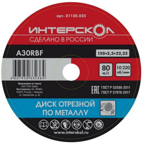 отрезной диск, по металлу, диаметр 150 мм, толщина 2.5 мм, посадочное отверстие 22.2 мм, 1 шт.