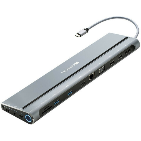 Бренд: Canyonмногопортовая док-станция "14-в-1" USB-C: 2x USB3.0, USB2.0, 2xHDMI, DisplayPort, VGA, USB-C с PowerDelivery, USB-C, RJ-45 1 Гбит/с, 2 кардридера SD/SDHC/SDXC и TF 3.0, алюминиевый корпус, неотсоединяемый кабель в оплётке, кнопка включения
