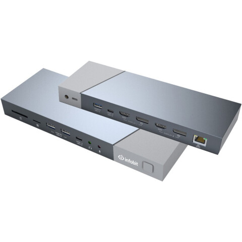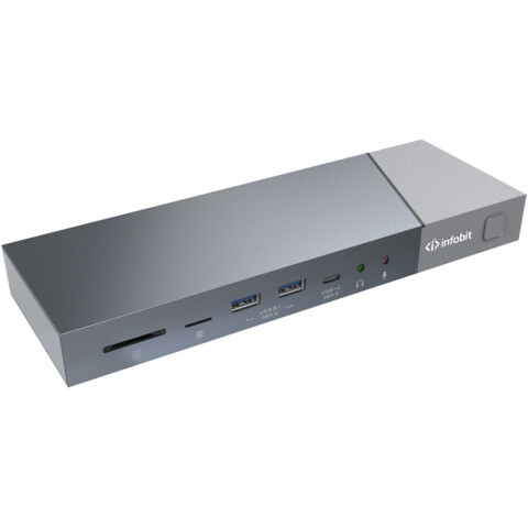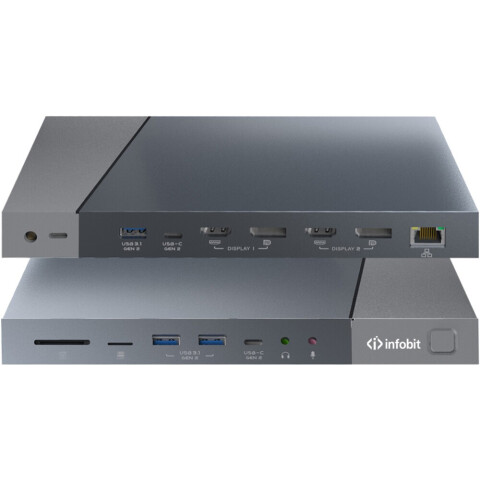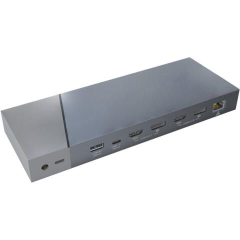 подключение USB Type-C, разъёмы: 2xHDMI, 2xDisplayPort, 3xUSB 3.2 Gen2, USB Type-C, 3.5 мм jack, сетевой интерфейс (RJ-45), питание от сети, кардридер: SD, microSD